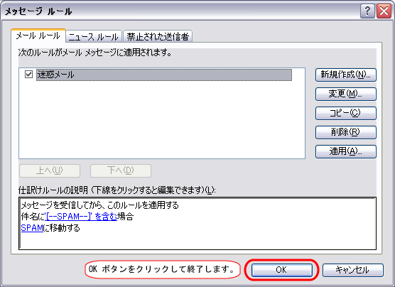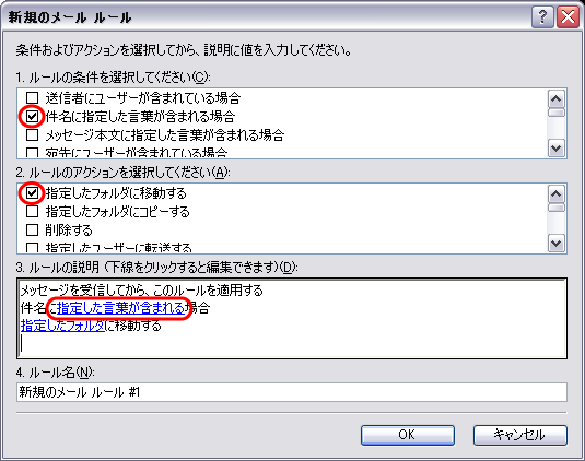 「4.ルール名」に「迷惑メール」と入力してOKボタンをクリックします。