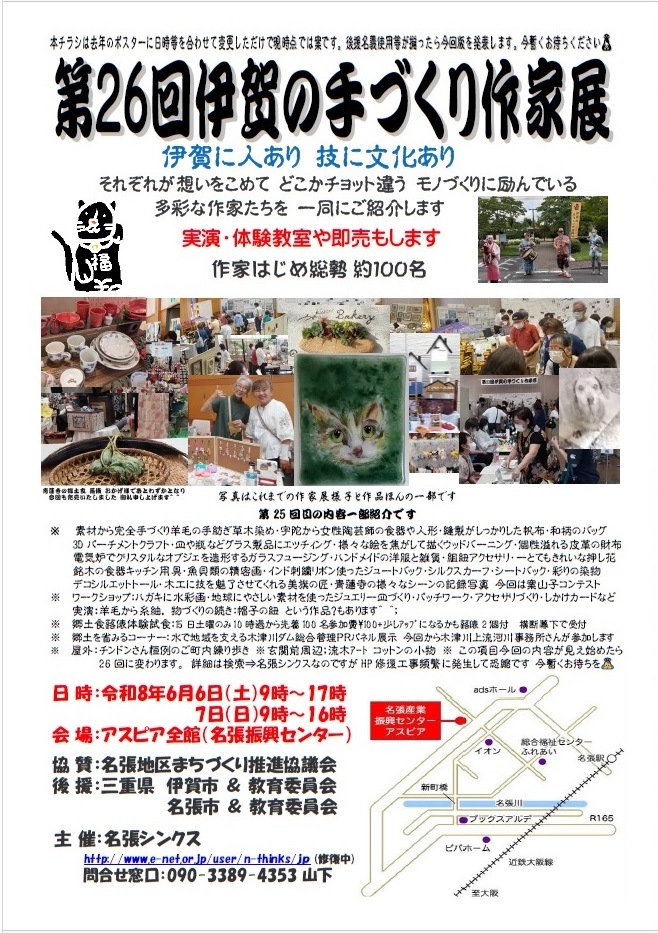 上記第26回伊賀の伊賀の手づくり作家展タイトルはも少し丁寧に表現するなら末尾に (案)と表記しておいた方がよろしいでしょうね。完成版ができるまでに写真や展示紹介など入れ替えしてバージョンアップします。その時に(案)を挿入しますので横着しますがよろしくお願いします🙇