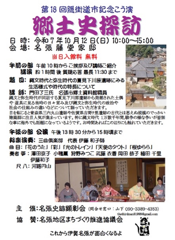 さて、屋内は階上にも拡げます。和室では邦楽演奏やお茶会はじめ 他の部屋では郷土史講演は伊賀名張の古代・壬申の乱、中世・黒田 の悪党、名張藤堂 家物語などシリーズを予定します。郷土を見直すという主旨から郷土史ミニ講座を毎年継続して実施していたことがあります。その流れから現在では水で地域のインフラを支える管理コーナーを実施してだいています。