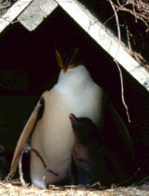 美しくシャイなペンギンたち まだ薄暗い早朝、朝靄に煙った牧場を歩き、広い砂丘の海岸に出た。 そこから起伏のある砂丘を縦断する。 牧場の車止めから歩き続けること小半時間、やっと小さな小屋に着いた。 小屋に細く開けられた窓から、崖を降りて海に向かうキガシラペンギンを観察する、サンシャインペンギンウォークと称されたツアーだ。 キガシラペンギンは、頭に黄色のメッシュの入った美しいペンギンで、光るようなレモン色の目を持っているので、ここではイエローアイと呼ばれている。 数が少ない上に、とてもシャイなペンギンだから、こうして遠くから観察するのである。 崖の上に、キガシラペンギンが顔を出す。 まわりを見渡しながら、ゆっくりと海岸に降りて行くのだが、姿を現してから海に入るまでは、もどかしいくらいに何度も立ち止まる。 早朝から砂丘を歩き続けるという実にたいへんな思いをして、そんなもどかしいペンギンを3羽見たらもう帰る時間だった。 このツアーは、ドイツから移住してきた夫婦によって運営されていて、一回の参加者は6名まで、体力に自信のある人に限られている。 実にタフなツアーだが、本来、野生の生物に会うにはそのくらいの覚悟が必要だし、それによって得るものも大きい。 そして、そんなツアーを運営している人がいることに感激した。 それでも、やっぱり体力的に心配という方には、オタゴ半島のペンギンプレイスがお薦めだ。 海岸に面した農場の一角を、キガシラペンギン、ブルーペンギン、そしてニュージーランドオットセイのために開放してサンクチュアリが運営されている。 シャイなキガシラペンギンも、ここでは鼓動が聞こえてきそうな間近で見ることができる。 地面に掘られた塹壕のような道に隠れて、ペンギンの目の高さで観察できるのだ。 元来は木立の影を使い、他のペアから見えない場所でしか営巣しないキガシラペンギンのために、三角屋根のペンギン小屋を点在させてあるのが少々白けるが、ここでは繁殖の手助けが第一義に考えられているのである。 さまざまな人たちが、それぞれの信念に従って、このシャイなペンギンの保護を実行しているのだ。 |