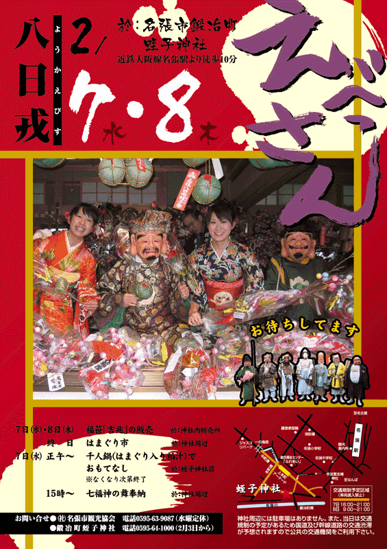 きのうは朝からちょっとした野暮用でサイトを更新できませんでした。無断でお休みしたら緊迫感がいや増すのではないか、などと考えていたわけではありません。 さてきのうとおととい、名張まちなかがお祭りの人出でにぎわいました。鍜冶町にある蛭子(えびす)神社の八日戎(えびす)です。ポスターがこれ。 いつもは閑散としている名張のまちが人であふれたのは、去年11月の隠(なばり)街道市以来のことでしょう。とはいえ私が子供だったころと比較すれば最近は八日戎も人出が減り、建ち並ぶ露店の数もずいぶん少なくなった印象なのですが、それでもこれはチャンスだと思い、「名張まちなかナビ」を配布するため7日の午後にまちなかへ出てみました。 まず名張高校に立ち寄りましたところお客さんと鉢合わせ。奈良県桜井市にお住まいだという中年男性で、「名張まちなかナビ」を片手に名張のまちを歩いてきたのだとおっしゃいます。桜井あたりの読売新聞に「名張まちなかナビ」の記事が掲載され(伊賀版の記事が回されたわけですが)、それで名張高校に連絡して郵送で現物を入手してくださったとのことでした。自分の家にヤクルトを配達してくれているおばさんが名張の出身であるということをのぞけば名張にはまったく縁がなく、むろん名張駅で降りたのもきょうがはじめてであるとのことで、名張藤堂家邸跡にも立ち寄って名張まちなかの案内地図を貰ってきたのだが、高校生のつくった「名張まちなかナビ」のほうがはるかによくできている、じつは自分は中学校の教師をしていたのだが、病気で身体をこわして退職してしまった、現在は農業をメインに生活しているのだが、生徒を指導して「名張まちなかナビ」みたいなものをつくってみたくなった、などといろいろおはなししてくださいました。 考えてみればこれは結構すごい話で、リーフレット一枚で名張まちなかに人を招き寄せるなんてのは名張市観光協会にもたやすくはできないことであろう。とか思いながら「名張まちなかナビ」の残部を確認し、八日戎で配布する分をバッグに詰め込んで私は学校をあとにしました。ジャスコ新名張店リバーナの駐車場に自動車を停め、ぶらぶら歩いて中町から本町の角まで来ると、もとは家具屋さんだった空き店舗でなにやら展示が行われています。入ってみますと7日と8日の二日だけ開設される作品展。さっそく関係者の方にお願いして「名張まちなかナビ」を五十部か六十部か、それくらいの見当で置いてまいりました。それからお祭りの中心、鍜冶町の蛭子神社へ。 ちょうど祭典の最中とあって境内はごった返しています。ちょっと腹も空いておりましたので鍜冶町から丸之内へ抜け、おぼこ飯店でラーメン一杯、五百円。それでまた蛭子神社に舞い戻ってみますと祭典は終わり、人波も引いていたのですが、これは困ったなと私は思いました。私は社務所かどこか参詣客に縁起物を授与するあたりに「名張まちなかナビ」を置いてもらおうと考えていたのですが、縁起物が山と積まれてスペースに余裕などありません。神社関係者は誰もみな忙しそうにしていて、配布を依頼するのは控えたほうがいいだろうと判断されました。 いや困ったな、とか思ってうろうろしている最中、知人とばったり出会いましたのでしばらく蛭子神社の前で立ち話。それでこの知人が伊賀市内の企業にお勤めであることを思い出したのですが、そういえば「名張まちなかナビ」は伊賀市内にはまったく出まわっておりません。バッグからごっそり取り出して知人に押しつけ、とりあえず銀座通りの Be、それから鍵屋ノ辻の数馬茶屋、あとは適当に、みたいな感じでお願いしておきましたので、伊賀市民の方も運がよければどっかそこらで「名張まちなかナビ」を入手していただけるはずです。伊賀市民のみなさんには、 「やーい。やーい。伊賀市にはこんなのねーだろー。やーい。やーい。伊賀市にはこんなのつくれねーだろー。やーい。やーい」 と名張市民が伊賀市民をあざ笑っていると思いつつ眼を通していただければありがたく思います。 そうこうしているところへ別の知人が通りかかりましたので、 「先生これ見てくれましたか」 と声をかけました。この知人はもとをただせば小学校の先生で、現在は写真愛好サークルの会長さん。 「おお見た見た。新聞で見た」 それで「名張まちなかナビ」をお渡しし、 「表紙の写真なかなかええ感じでしょ」 とか喋っておりますと、 「しかしこれ、どこ探してもあんたの名前が出てこんやないか」 とのご指摘をいただいてしまいました。きゃはは。だっておいら伊賀の忍びなんだもん。 そうこうしているところへ制服姿の女子高生四人組が通りかかります。うちふたりがなぜかにこにこしていて、よく見てみたら私の教え子。近くまで呼び寄せ、うちひとりが1月23日の最後の授業を欠席していたことを思い出しましたので、 「おまえ授業はサボってもこういうときは絶