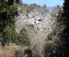 伊賀見の槻の木橋から紅ヶ岳を見ると、頂上直下から急な尾根状の斜面が見える。この部分だけ岩壁が切れていて、うまく植林帯を使えば頂上へ達する最短コースが設定できそうだ。 |