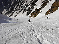 | 11時 毛勝谷の途中 I: めっちゃ暑い、目眩がする N: わしはここらへんでやめよかな、しんどいわ K: こんなとこにいたら、ブロックお見舞いされるで T: よう寝たのに眠いなあ C女、H女: ...黙々と登る... 12時 おなじく毛勝谷の途中 N: コルはまだかー、遠いなー、ここらでやめよかなー I: しんどいなー、眠いなー T: はひふへほ、スキーがだんだん重くなる K: 誰や、もうすぐ着く言うたんは C女、H女: ...黙々と登る... 13時半 コル I: あーしんど、着いたぞー C女: みかん! T: おおう、劔が見えるぞー K、H女: (下の方から)ホンマにそこはコルやろな N: (ずっと下の方で)...無言... |